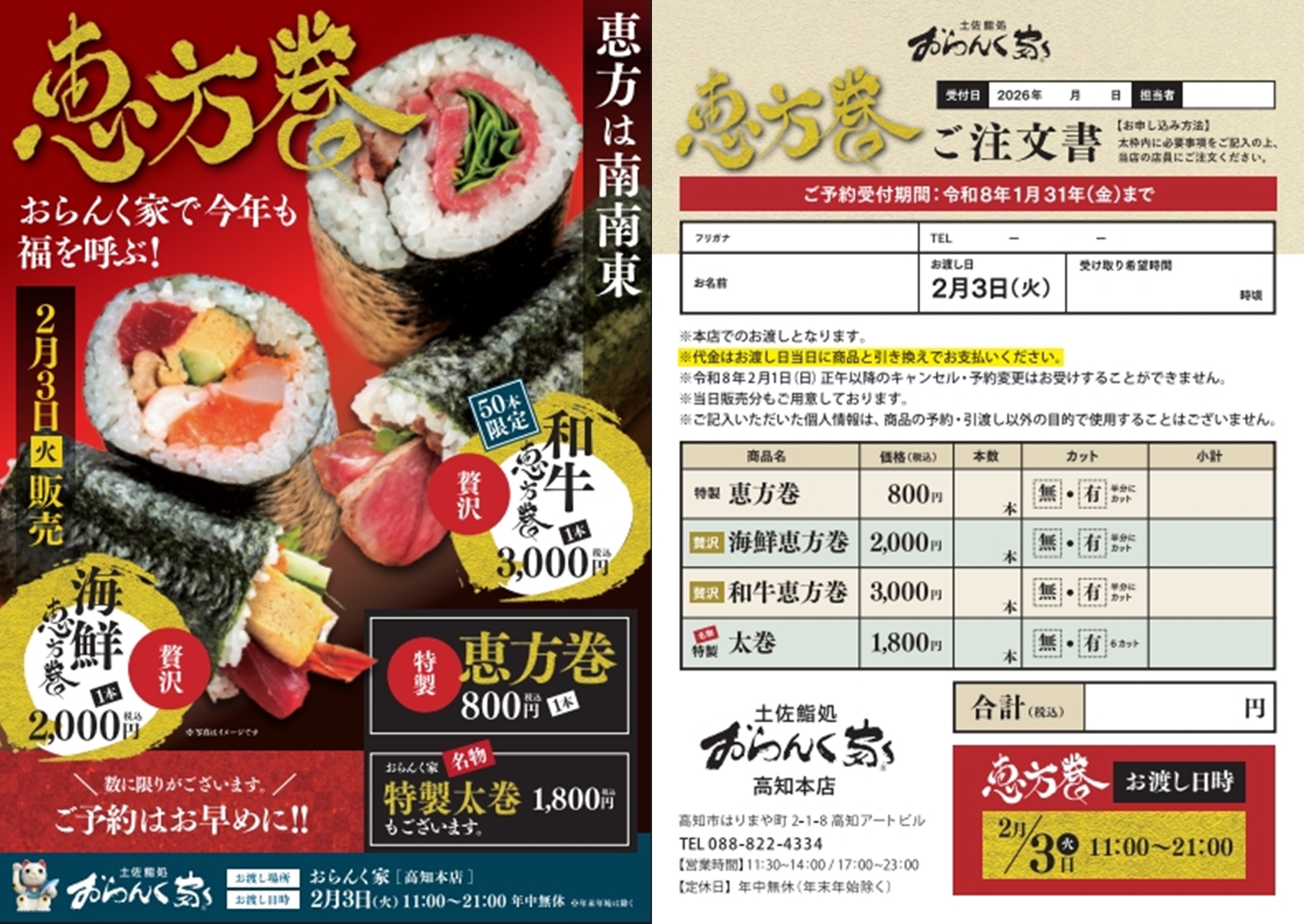 [2026.1]2026 今年の恵方は南南東!! おらんく家 恵方巻 ご予約承り中!!